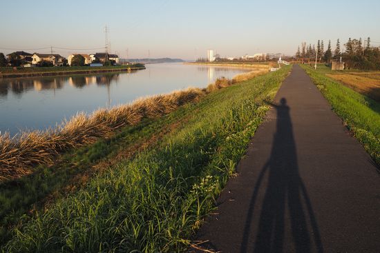 関枠橋を渡って手賀川のCRに入りました。朝日を背に受けて、私の影が路面に映っています。