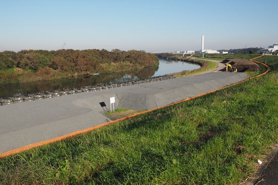 江戸川CRの海から29Km地点に出ました。河川敷では何やら工事が行われています。