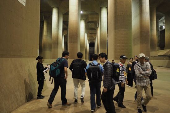 長い階段を下って調圧水槽の底に降り立ちました。女性ガイド2名が付き添います。この日、最初の10時の