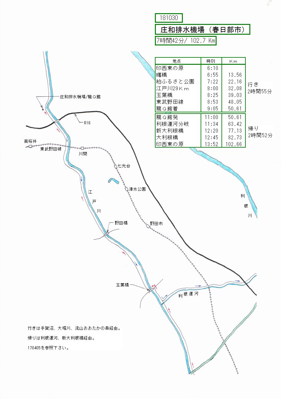 野田橋を過ぎ、東武野田線と国道16号線の下を通過すると、1Km程で庄和排水機場です。この建物には