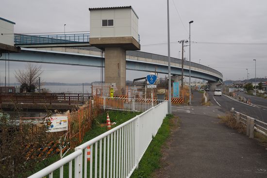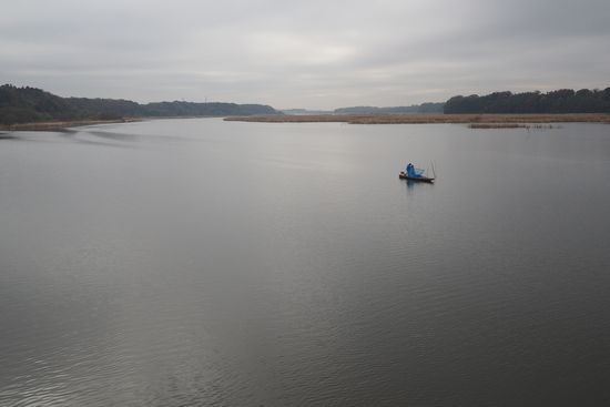 台地から坂を下って茎崎橋を渡ります。橋から南方向を撮影。折しも、四手網で漁をしている船がありました。