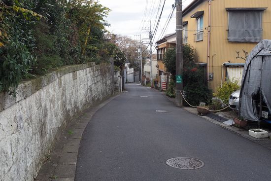 上矢切交差点から80m程の所を左折して坂を下ります。