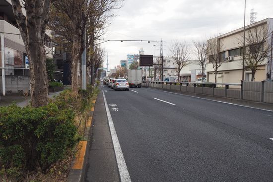 中川大橋を過ぎた国道6号。道の正面にスカイツリーが見えています。6号というのは、交通量が多い上に
