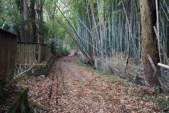 横戸台からの道はやがて柏井橋からの道に突き当たります。そこを左折し100m程の細い道に右折。竹林が