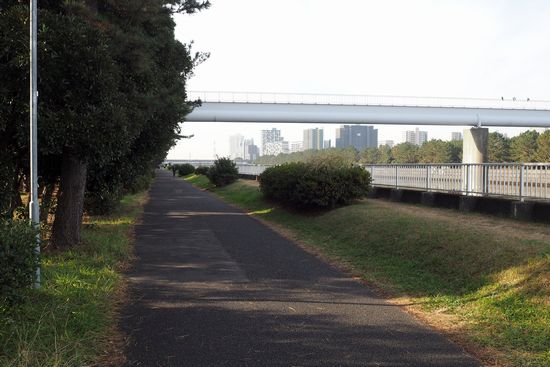 花見川CRも大分下流まで来ました。幕張のビル群が見えてきました。市街地なので、ジョギングや散歩の人が
