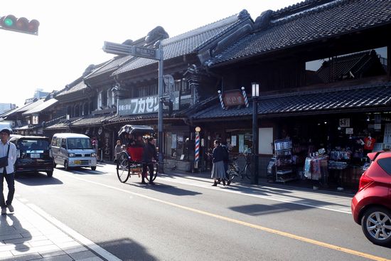 蔵づくりの街並みです。外国人を含む観光客が多く、人力車も走っています。