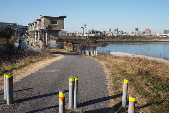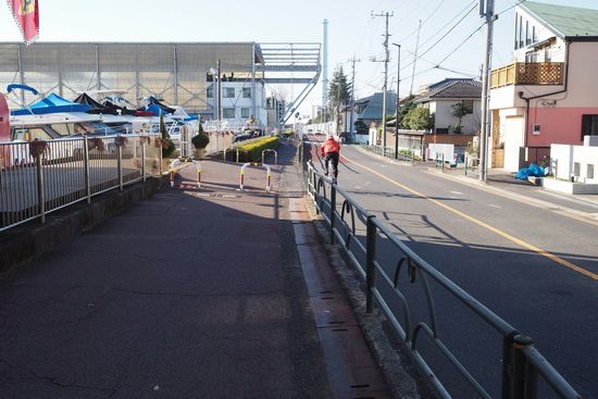 これが旧江戸川沿いの自転車道です。折しも、自転車道ではなく車道をロードバイクが1台、通過して