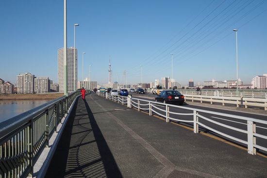 船堀橋を渡ります。快晴。行く手にスカイツリーが見えてきました。