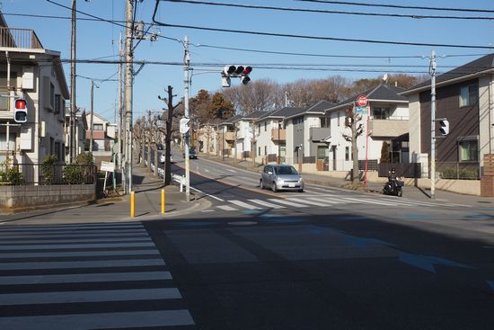 ここは名戸ヶ谷小学校から1.5Km来た交差点です。ここで画面中央の車のいる坂道に右折して南柏に