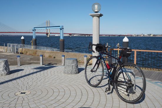 バイパスが終わり、再び国道より川側の裏道で銚子の河岸公園に着きました・快晴です。長大な銚子大橋