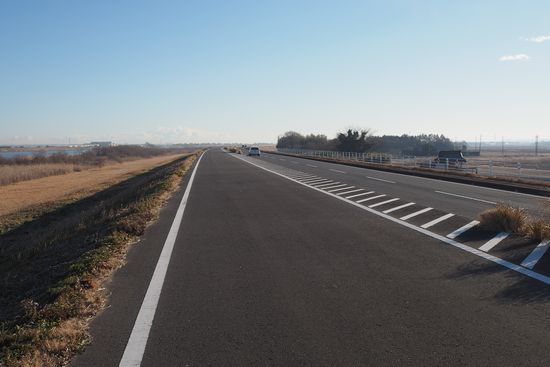 神崎大橋を過ぎて佐原に向かうサイクリングロードです。隣を走る国道との段差が小さい上に、2車線の