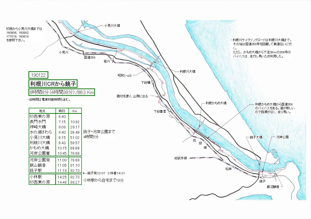 2018年に内陸ルートから銚子に行きました。(180209) 起伏が多く、かなりきついルートでした。利根川沿いに下って行け
