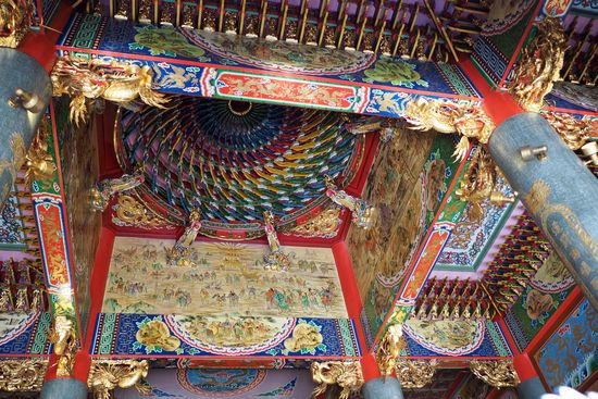 本殿の天井です。正に色彩のワンダーランドですね。渦巻き状のドームは、釘を一切使わない構造だそうです。