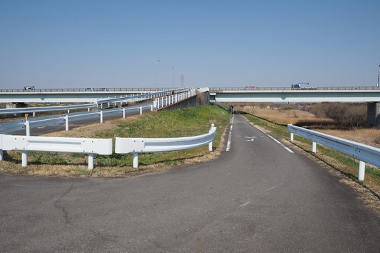 自転車道を国道254号までやってきて、落合橋を渡ります。橋の途中の「越辺川」の看板の所で左に