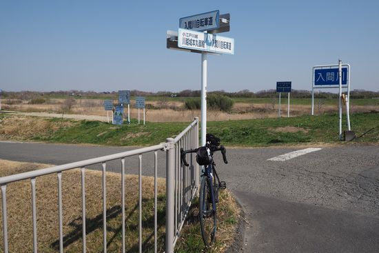 入間大橋を渡ると道路標識が現れます。入間川自転車道に入ります。