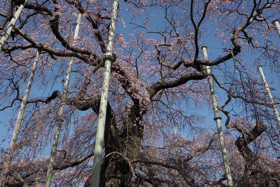これが「般若院の枝垂れ桜」の全容です。推定樹齢400年、高さ10m、幹囲5mの威容を誇っています。