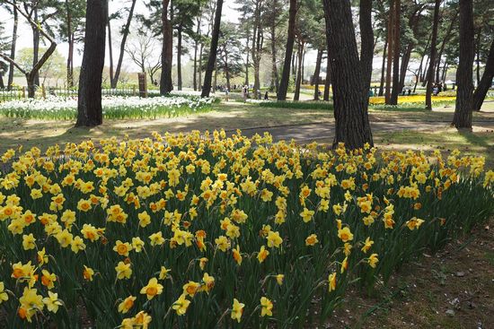 西口からみはらしの丘に向かう道すがら、松林の中に、水仙の群落がありました。