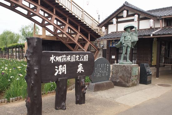 園の中程に、潮来の伊太郎の像があります。その奥の建物は、観光船の乗り場です。
