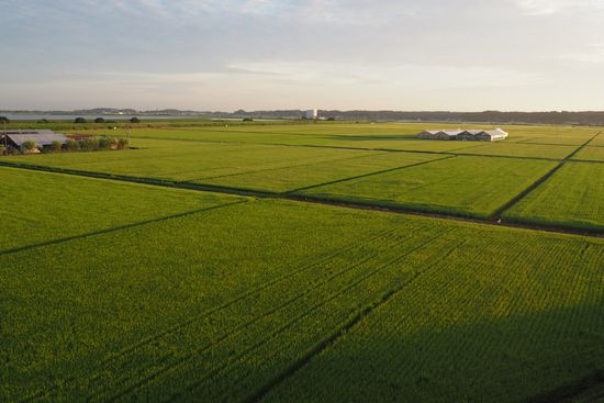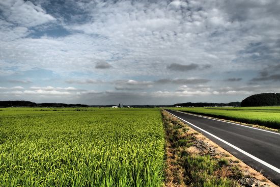国道464の北須賀交差点を過ぎた高架部分から田圃を撮影。画面左遠くには、北印旛沼の水面が見えています。