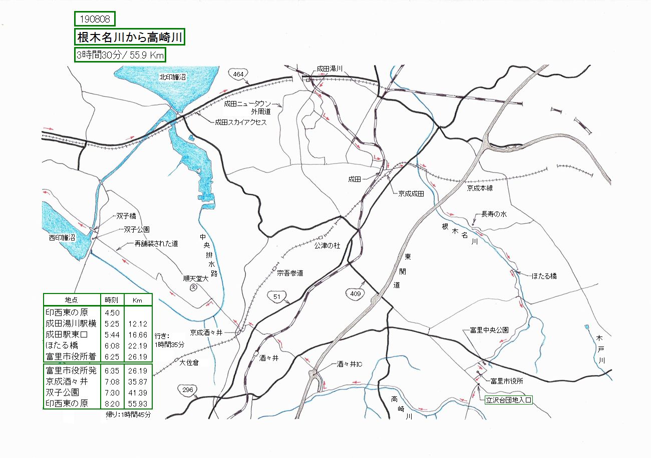 さて、成田駅東口から坂を下り、国道51号を渡り、京成本線(高架)の下の道から、右折して根木名川沿いの