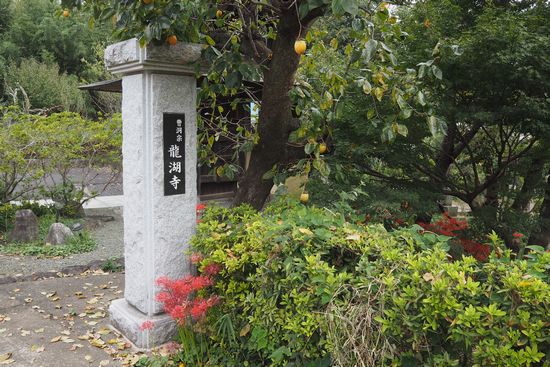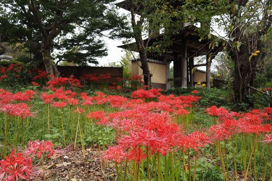 龍腹寺の先から仄暗い森のなかを下って、下の広い平野に降り立ち、龍湖寺に着きました。山門脇に彼岸花