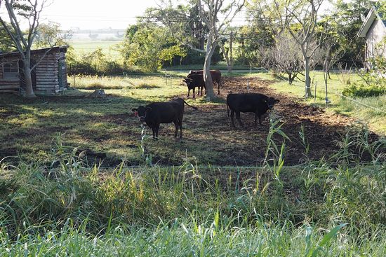 圏央道を過ぎると川辺に畜舎があり、牛が飼われています。チーズも作っているようで、手作りの看板が
