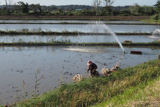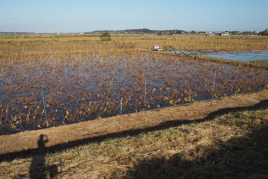 河口水門を過ぎて稲敷大橋に向かう左側は、浮島の蓮田が広がります。私の影が写っています。