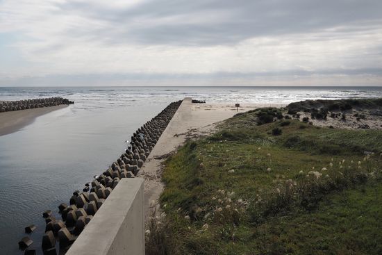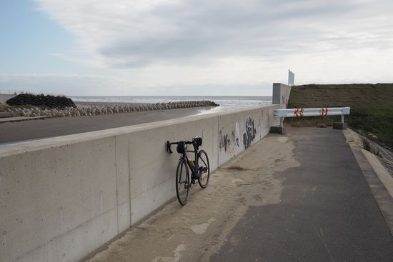 県道30に出たら、後は木戸川の堰堤の上を走って、海岸の土手に至ります。あとは徒歩で土手を越え、堰堤の