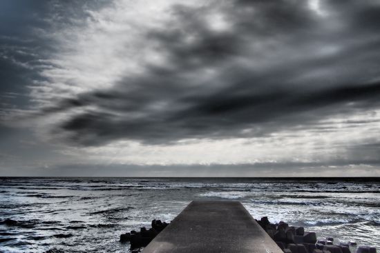 堰堤の先端から海の眺め。コントラストを強め、色彩を抑え、雰囲気を高めて撮影しています。時折、雲間から