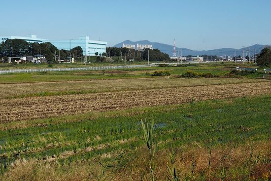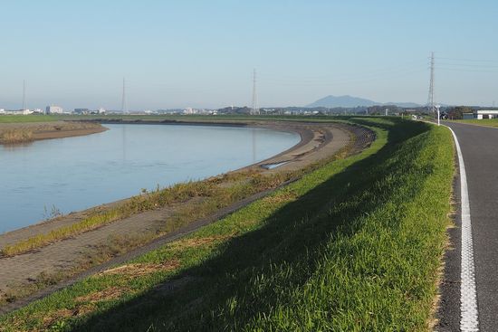 蓮沼川の左岸でR19に達しました。筑波山がだいぶ近づいてきました。ここで右岸に渡り、薄青いビルが