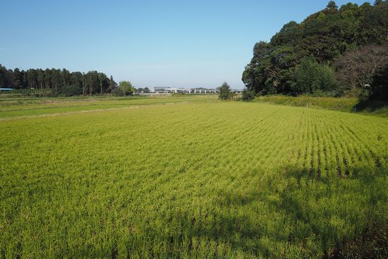 これは筑波牡丹園付近の谷津の景色です。遠くに常磐道が見えています。田圃が緑できれいですが、