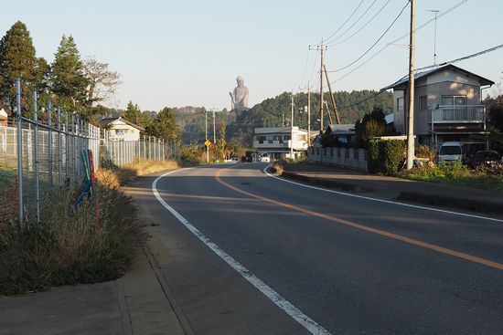 ここは下久野交差点を過ぎ、乙戸川を渡る橋に向かう途上です。正面に牛久大仏が大きく見えます。