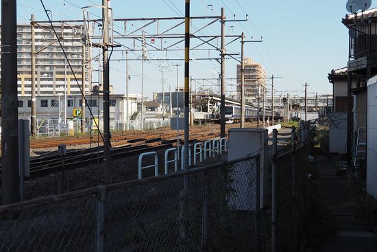 常磐線を渡る踏切です。電車が止まっているのが荒川沖駅です。