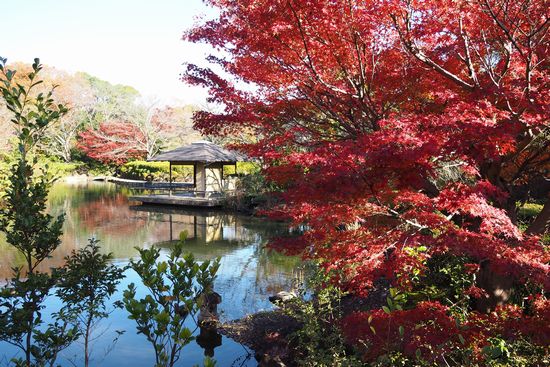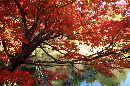 入口から池までの間、楓が並木として植えられています。真っ赤に紅葉していました。