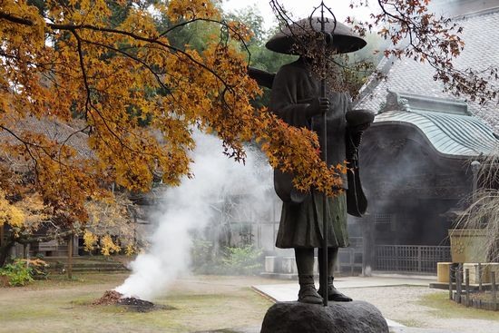 弘法大師(空海)の像です。紅葉と落ち葉焚きの煙が、いい雰囲気を出しています。