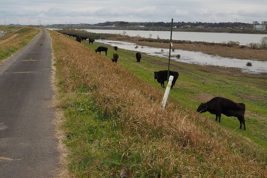 常総大橋近くの土手の斜面で、多くの牛が草を食んでいました。自転車から僅か数メートルの距離です。