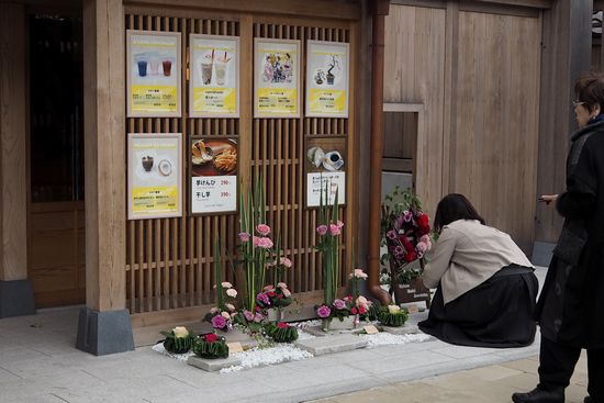 とあるお店の前で、花を飾る作業中でありました。