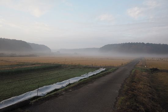 いつもの師戸川谷津道で印旛沼に向かいます。今日は暖かくて霜も無し。朝靄が出ています。