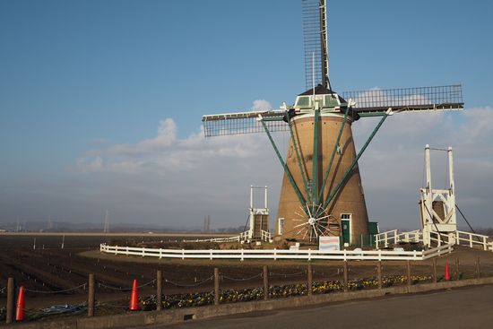 佐倉ふるさと広場の風車に着きました。ここで気が付きました。このアングルだと、風車の左側遠くに