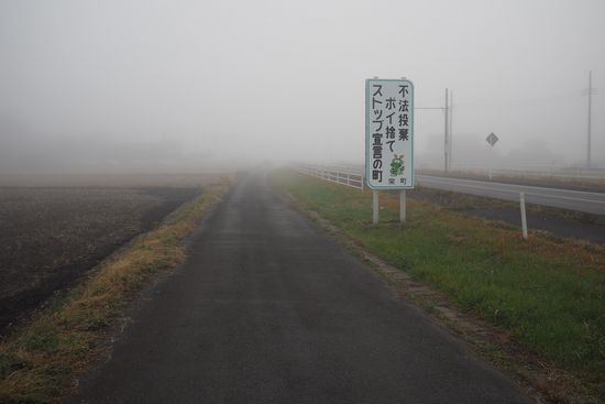 えらく霧の出た朝でした。ここは若草大橋に向かう国道356の側道です。視界は50m程でした。