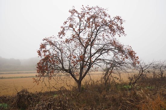 土浦に向かう桂川の谷津道です。依然として霧です。ところで、これは柿の木です。小粒ですが沢山の実を