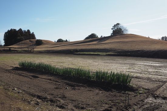 古墳の北側の農道から全体を撮影。全長186m。5世紀後半の築年から、被葬者は、茨城国造の筑紫刀禰尊