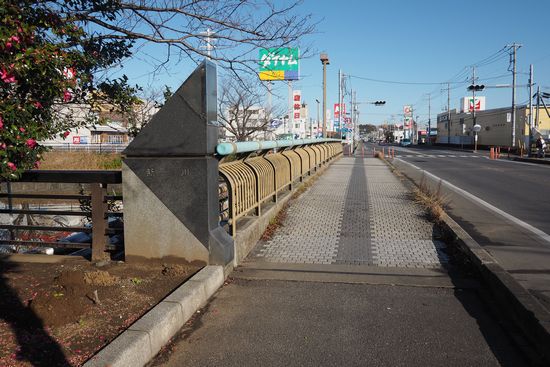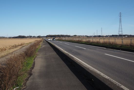 台地から恋瀬川沿いの平地に降りてきました。前方に恋瀬川を渡る橋があります。更に遠くには、舟塚山