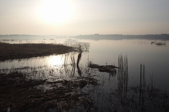 いつもの印旛沼を逆光で撮ってみました。手前が水面だけだと単調なので、師戸川河口を入れてみました。