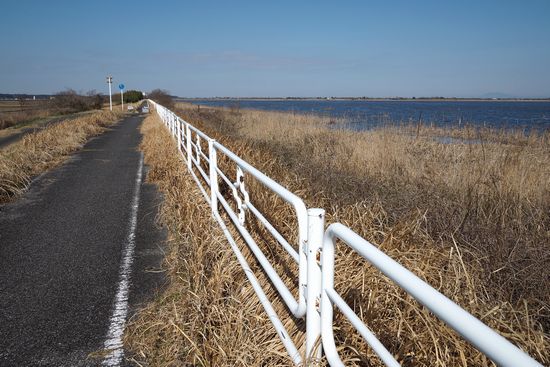 北印旛沼に出ました。強い北西風が吹いています。写真では定かではありませんが、筑波山が