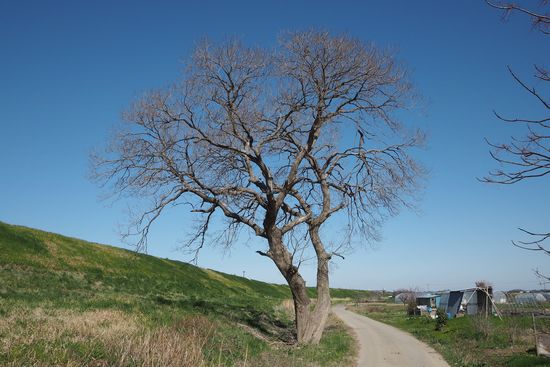 調整池内にある印象的な木です。この先で暫く舗装がなくなります。