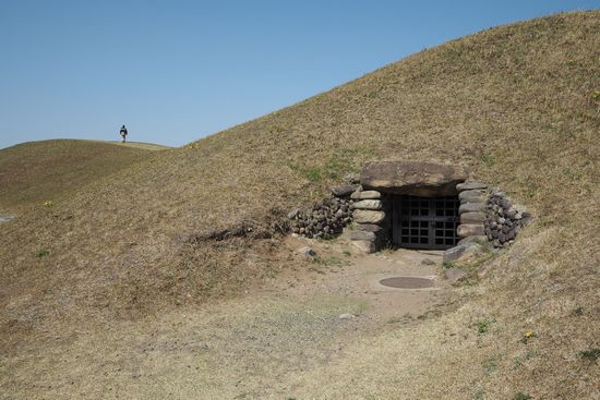 後円部に横穴式石室があります。今は復元されていますが、発掘時は壁が崩れて潰れていて、それゆえ