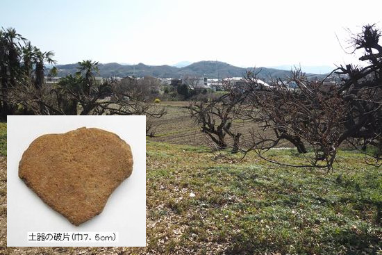 前方部と後円部の鞍部で、鳩サブレーみたいな土器のかけらを一つ拾いました。