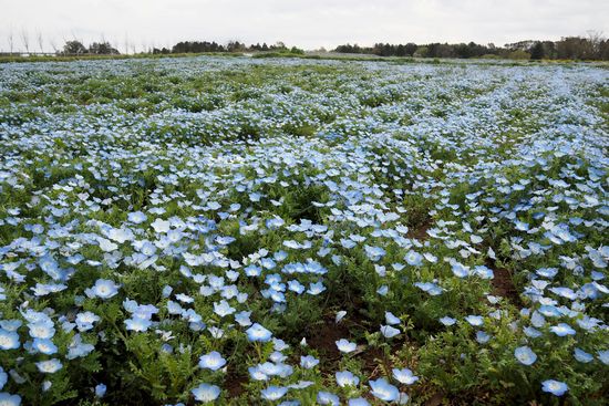 芝さくらの区画の手前に、ネモフィラの植えられた区画があります。ネモフィラといえば、ひたち海浜公園