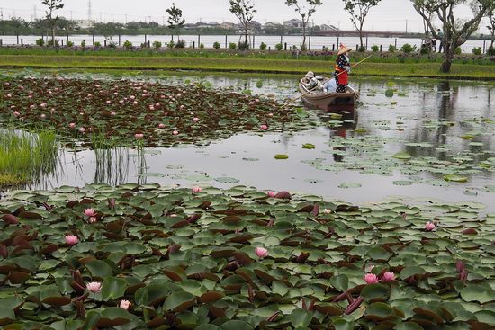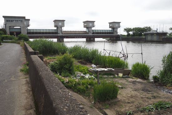 河口水門を通過すると、左手に浮田の蓮田が広がります。